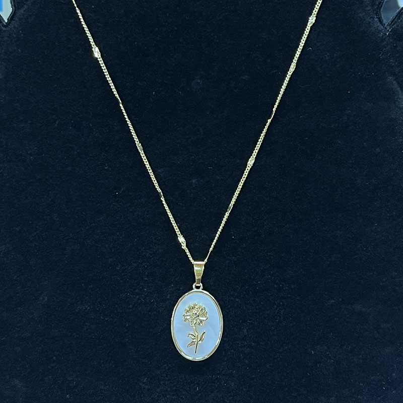 De hanger zelf is ovaal van vorm, met het bloemenontwerp in het midden in reliëf en biedt een tijdloze, vintage-geïnspireerde look. De moeder-van-parel Dient als de achtergrond, met zijn zachte, parelwitte kleur die een subtiele gloed toevoegt, terwijl het bloemenmotief een vleugjenatuur en elegantie aan het stuk brengt. De goudplating Verbetert de algehele glans en afwerking, waardoor een vleugje weelde wordt toegevoegd.